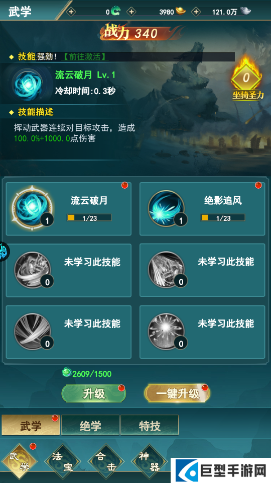 1、技能包括了武学,绝学,特技三个分类,每个分类之下还有众多的技能可以进行学习。