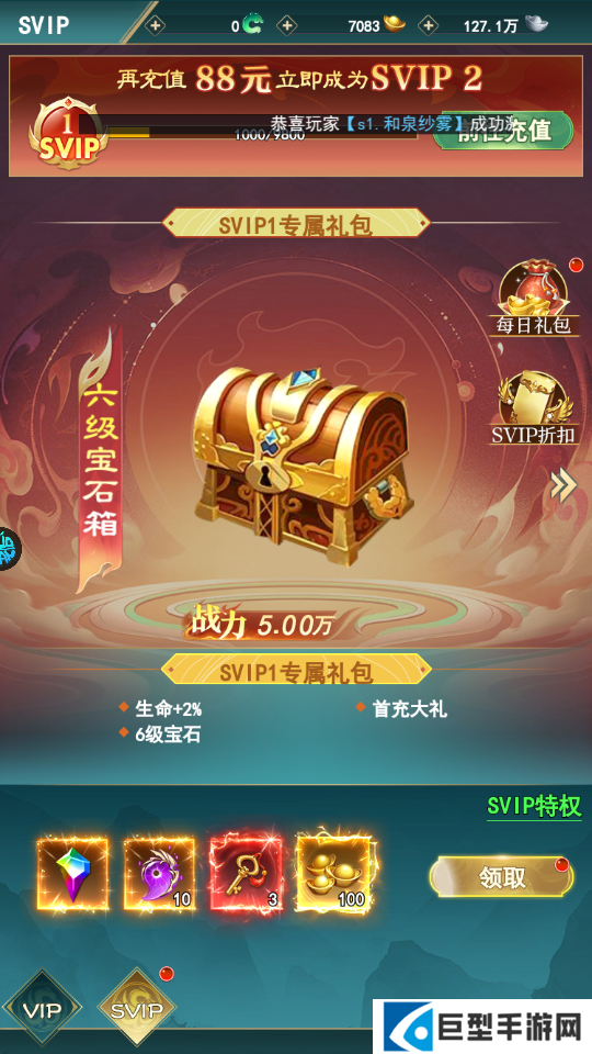 5、上线即送满级VIP,VIP特权全开。