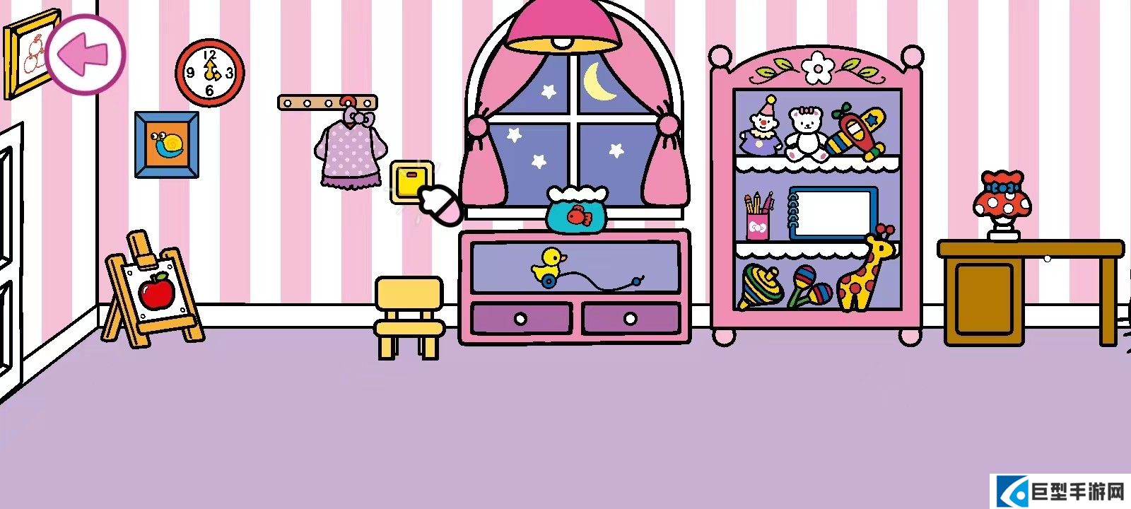 5、凯蒂猫只要有想要的东西,头顶上就会冒出气泡,当全部点完以后,再关灯;之后就可以点击左上角的那个按钮;