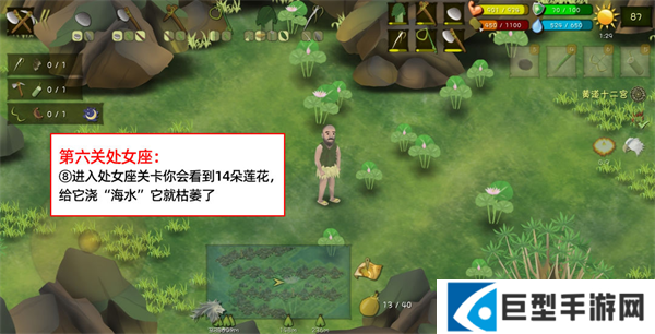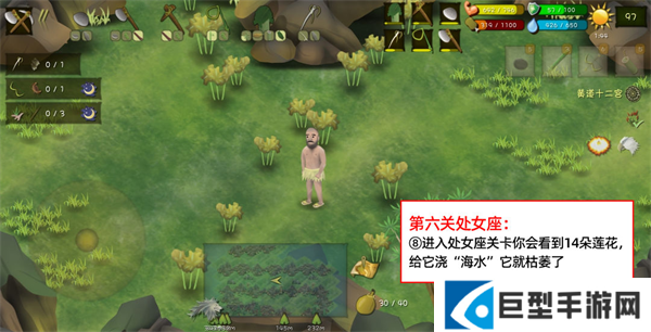 (提前准备14个竹筒装满海水,在来处女座关卡给莲花浇水)