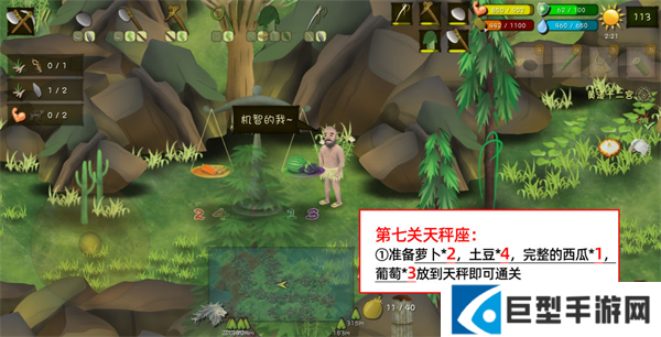 ①准备萝卜*2,土豆*4,完整的西瓜*1,葡萄*3放到天秤即可通关