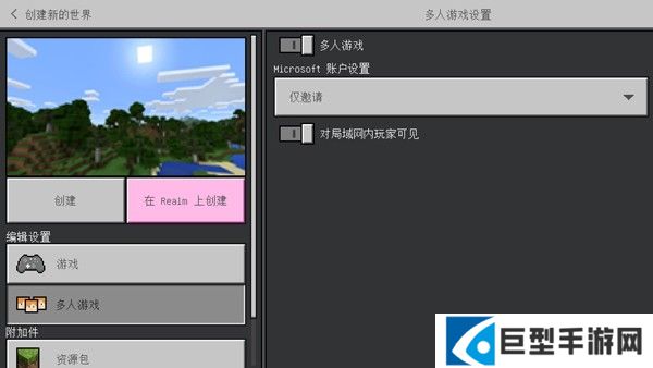 2、点击游戏——新建——创建新世界,关于创建世界的设设置,自己根据喜好进行设置,但关于多人游戏的设置,一定要打开,也要打开”对局域网的玩家内玩家可见“这个设置,minecraft账户设置建议调成仅邀请,避免其他玩家进入。