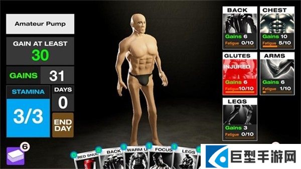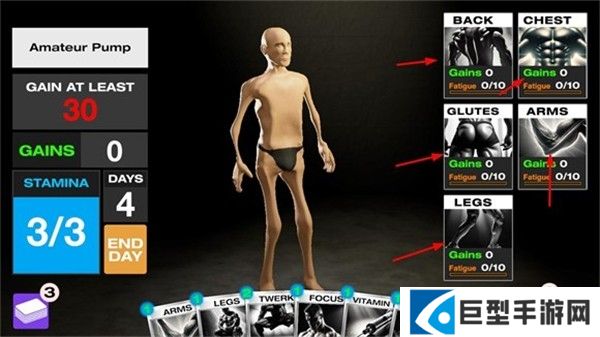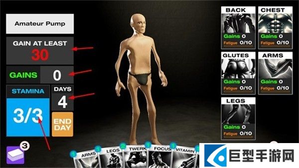 1、左侧显示目标进度、角色的肌肉量、剩余天数以及能量数,玩家需要在规定的天数内达成设定目标才能获胜。