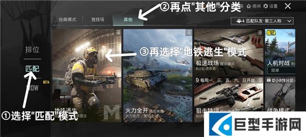 4、选择“匹配”模式,再点“其他”分类,再选择“地铁逃生”模式,点击即可进入,战栗深邃,地铁逃生。