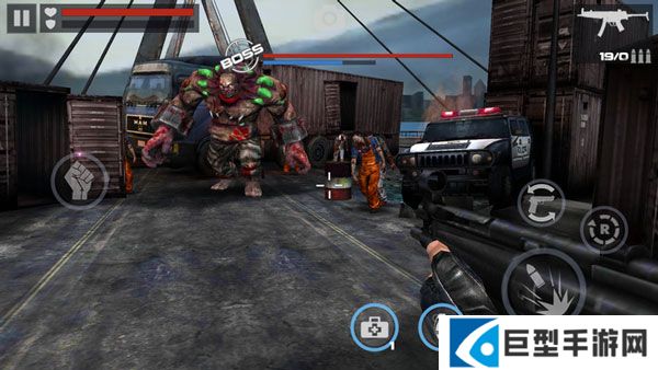巨岩怪是前期任务中的一头拦路虎,是僵尸头目,有着超高的血量和攻击,如果武器不好的话根本无法将其击杀。在准心那里有个油桶,当巨岩怪走到那里的时候攻击油桶它就会爆炸,对巨岩怪造成伤害。在这里还要同时注意其他小僵尸,被围攻了很容易死掉,建议这一关买了第三个武器(散弹枪)的时候进行尝试。