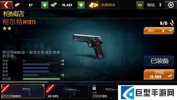 需要升级才能解锁更强力的枪支,并需要黄金购买才能使用。游戏开始送一把初始的手枪和冲锋枪,使用游戏现金升级,升级次数也是受玩家等级影响。在无法购买后续的枪支时,升级已有的枪支是不错的选择。