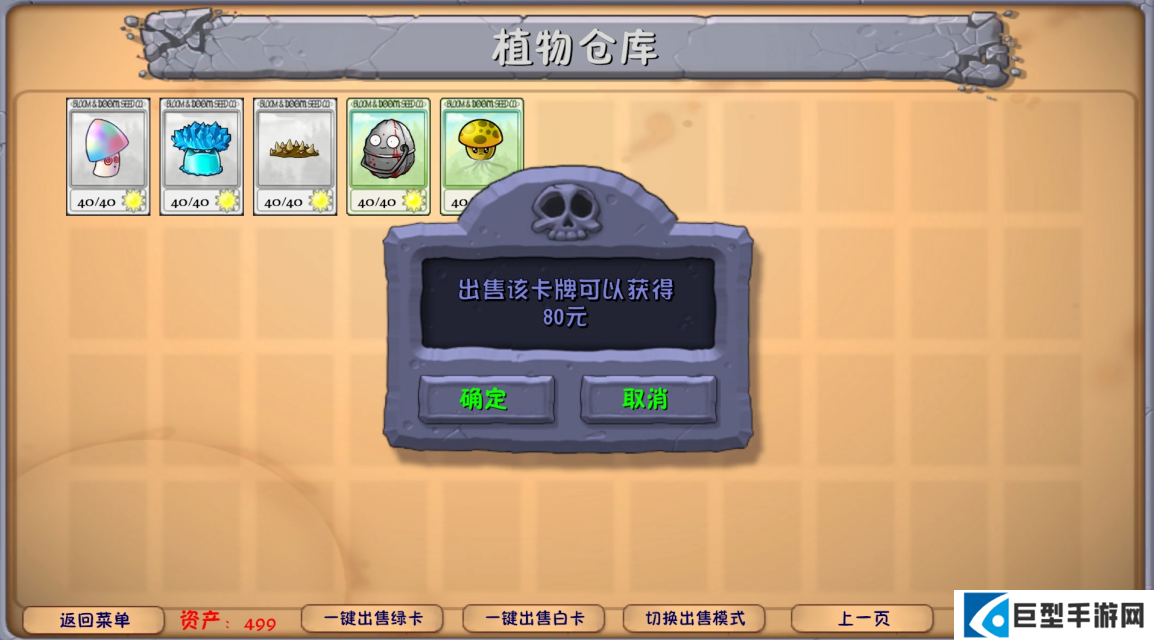 1)普通出售,点击植物卡面查看售卖价值并选择是否出售。