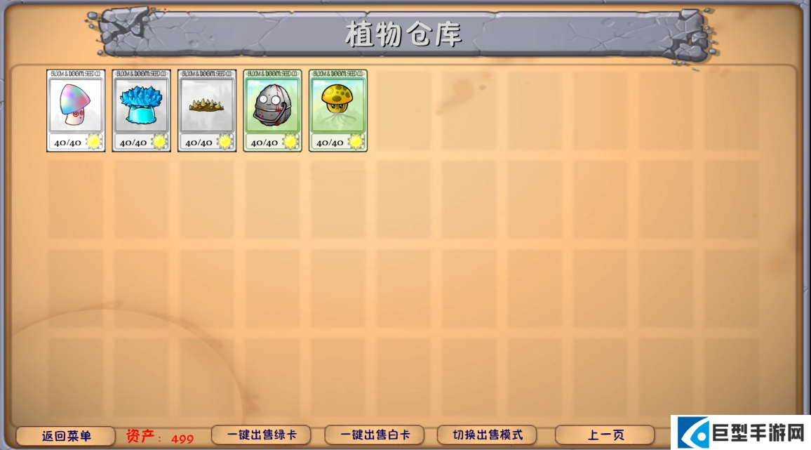 6、你可以在仓库中查看植物的同时点击植物卡面查看其售卖价格,想要出售的植物点击“出售”按钮即可出售,收买后资产数增加对应值。你也可以点击下方UI中不同按钮来直接出售所有白卡,直接出售所有绿卡,切换出售模式。
