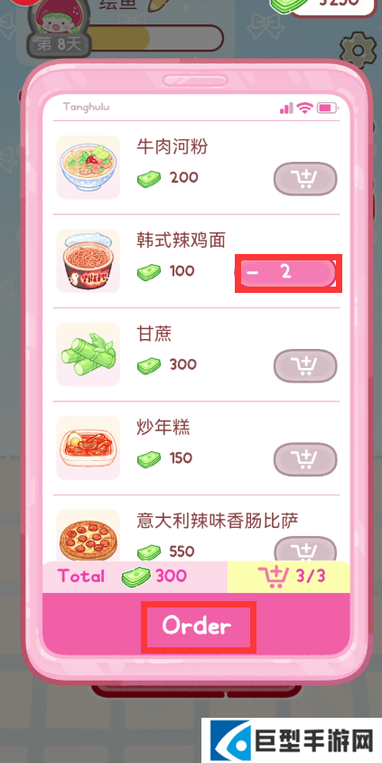 2.在点餐界面选中想要的食物加入购物车,点击Order