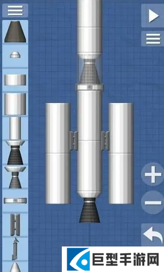 4.在鹰发动机下面的隔离器下方放一个长燃料箱和中燃料箱,在最下面加上鹰发动机;然后在长燃料箱两侧加上分离器,在分离器两侧各加长燃料箱+中燃料箱