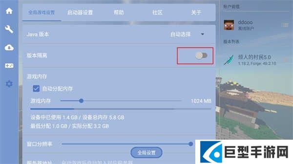 5、如果没看到村民版本的话来到设置里打开版本隔离,重启游戏。