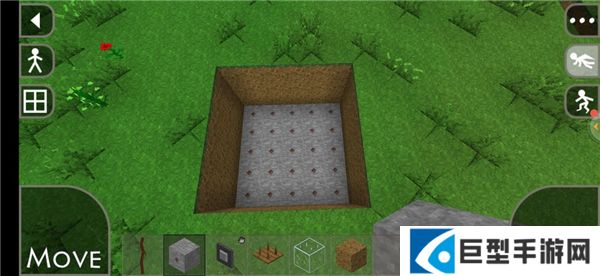2、首先挖一个大小随意的坑,这里用5×5的作为演示,往下挖四格以后再最底下一层铺上穿线石。