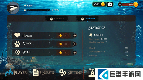 1、用金币能增加属性点,可以看到虎鲸的详细数据,点击play就可以开始游玩了
