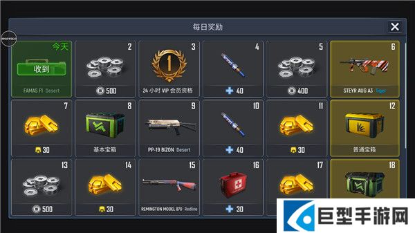 2、进入游戏后,玩家可以通过每日签到获取各种游戏奖励,每天的签到奖励都不相同,可以是金币奖励,也可以是枪械的皮肤