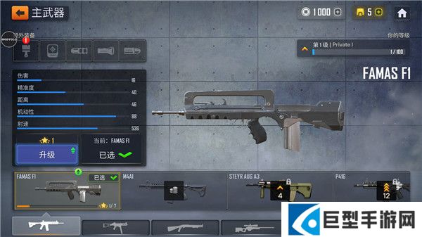 3、点击左下角枪械进入枪械库为自己的各种武器增加各种的皮肤,在此同样可以看到枪械的各种熟悉,比如伤害,精准度等等,同时还支持升级枪械的各种属性