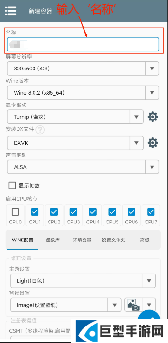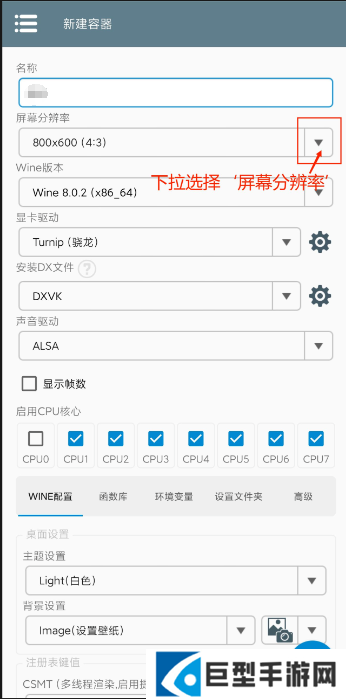 5.新建容器界面下滑,下拉选择‘设定显存大小’(建议手机配置较低的,显存大小调小点)