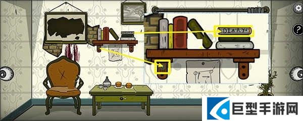 6、向右滑动视角进入窗户区域,在书架中央获取【日记本】和【齿轮1】。