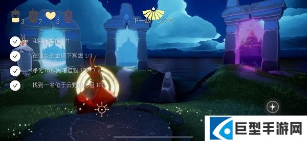 找到黄色人影,与它们互动 收集“光之翼”,我们的 飞行技能就可以得到 升级――斗篷背后 星星的数量就代表我们的飞行级别。