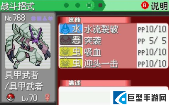 剧情给的胆小虫进化而来。推荐SL出一只属性不错的,不奢求多少v,起码物攻不要太低,性格过得去就行。核心技能是迎头一击,特性约等于半个逃脱按键,配合咆哮虎打前面几个道馆会比较舒服。它打道馆确实作用不算太大,但最主要的价值是打npc(尤其是真司)。那byd赖皮得很,咱们初期没有努力值没有道具,很容易被吊打,这时候就需要一个先制技能挺身而出。我的分配是252生命,252物攻,6特防,配突击背心。