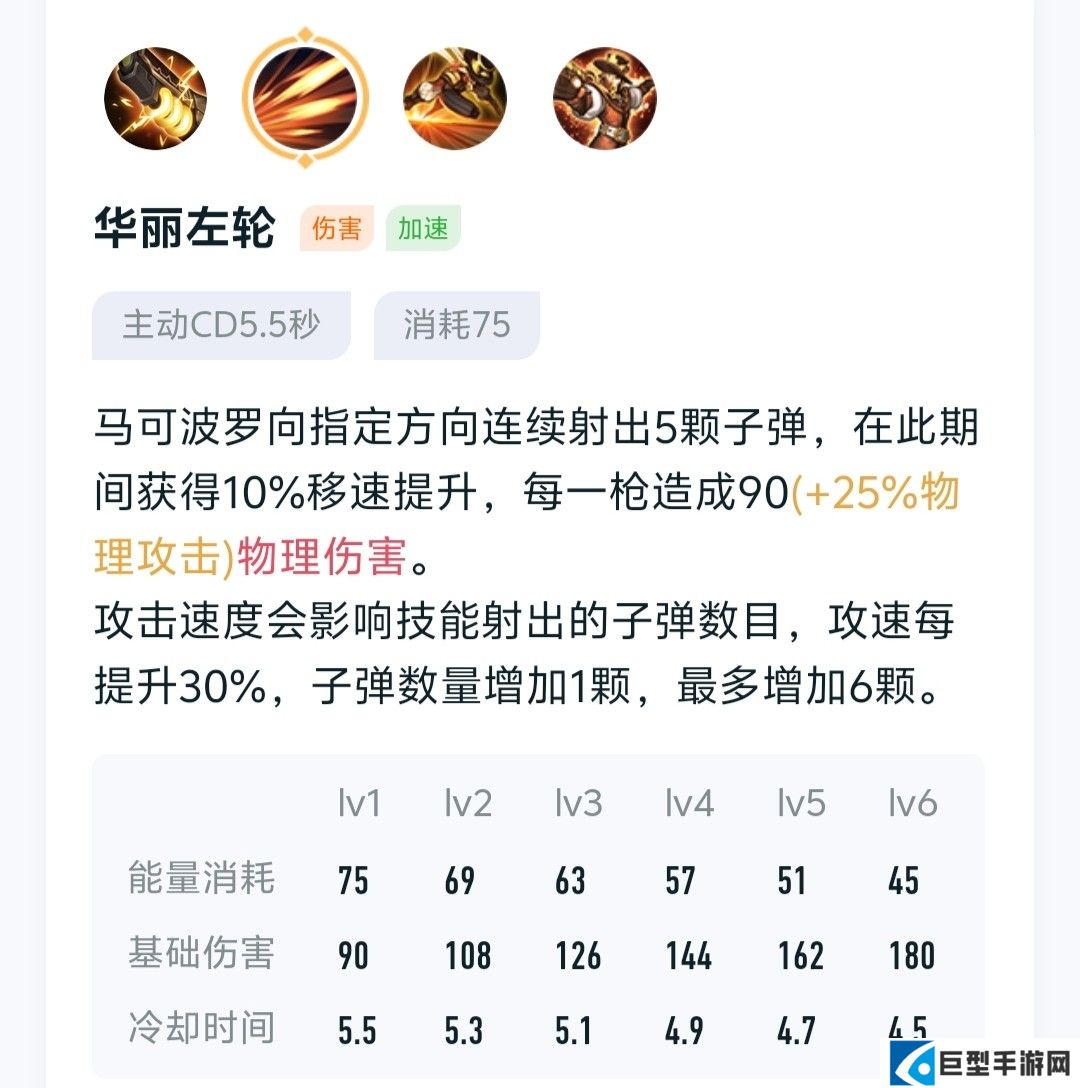 马可波罗向指定方向连续射出5颗子弹,在此期间可以移动并且获得10%移速提升,每一枪造成90~180(+25%物理攻击)物理伤害。此外,攻击速度会影响技能射出的子弹数目,攻速每提升30%,子弹数量增加1颗,最多增加6颗。马可普攻是比较慢的,即使攻速提上去了伤害也比较有限,一技能和大招是马可主要的输出手段,而一技能又可以快速叠加印记,适合先手使用叠加印记,后再考虑接大招。