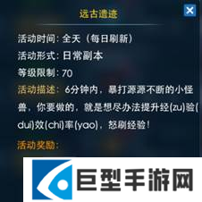 看这远古遗迹副本的介绍,别的没有,有的只有是经验!进入副本还可以通过特别的方式来提高经验的获取。在副本里可以喝上经验药水,可以鼓舞提升自己的伤害,多人组队拉上自己的朋友一起也可以提升经验。这里获得的经验可以用海量来形容非常恐怖,不信自己试试。