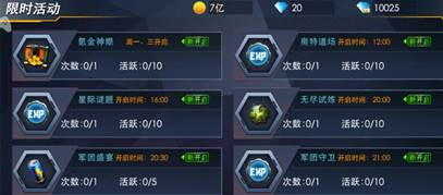 在《奥特曼热血英雄》中等级是非常重要的,其中有很多的活动都可以提供大量的经验。限时活动的入口还是日常。像是“氪金神眼”“奥特道场”“星际迷题”“军团盛宴”“军团守卫”等等活动都是获得大量经验的好途径。