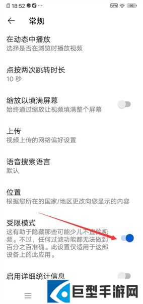 4、在最下方有一个“受限模式”大家点击一下就关闭了,蓝色就代表打开状态,灰色是关闭状态。