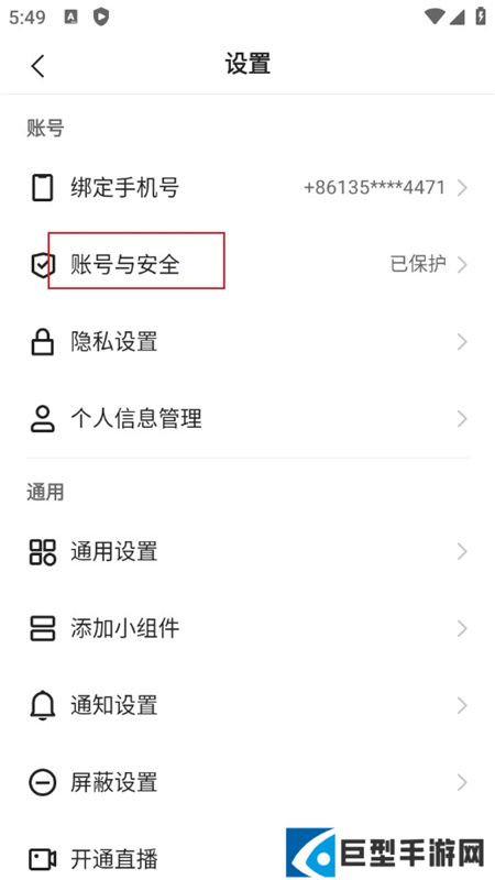 4.在设置页面中,找到"账号与安全"选项,点击进入。