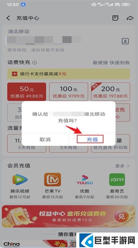 5、然后会弹窗提示你确定给这个手机号充值,确定手机号码无误后,点击充值按钮即可。