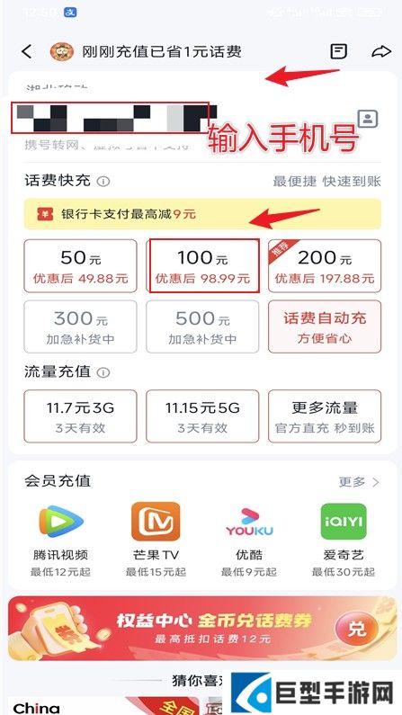 4、进入到话费充值中心界面,输入要充值话费的手机号、选择充值话费/流量;