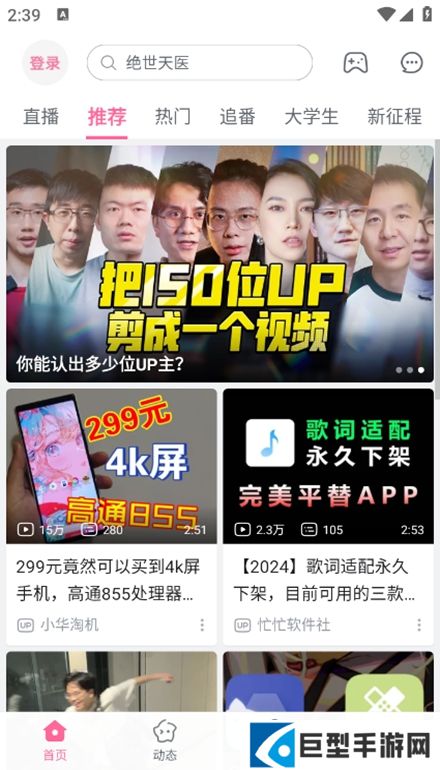 软件功能动态:登录账号,查看自己关注的UP主、频道动态