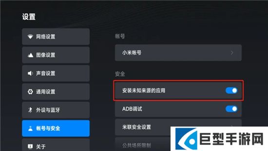2、在小米盒子的【设置】-【账号与安全】里,选择允许安装未知来源的应用。