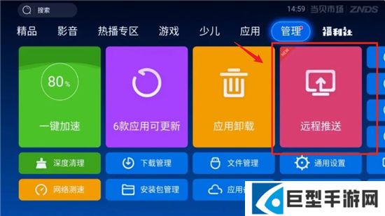 第1步:如电视机已安装当贝市场,下载上面的安装包,然后打开当贝市场,首页【管理】中找到【远程推送】