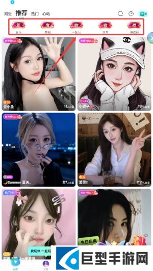 2、进入首页后,在直播分类区域选择如游戏、才艺等您感兴趣的直播类型。