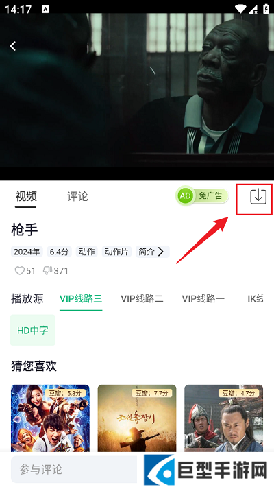 2、进入APP主界面后,挑选一部自己喜欢的视频,这里我以《枪手》这部电影举例,点击进去后,在视频右下角有一个下载图标,点击即可缓存视频到手机。