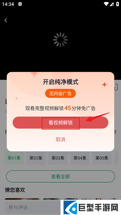 3、弹出开启纯净模式窗口,这里我们直接点击看视频解锁按钮即可。
