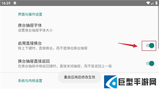 3、进入到界面操作设置选项,打开启用直接换台开关,然后重启应用即可生效。