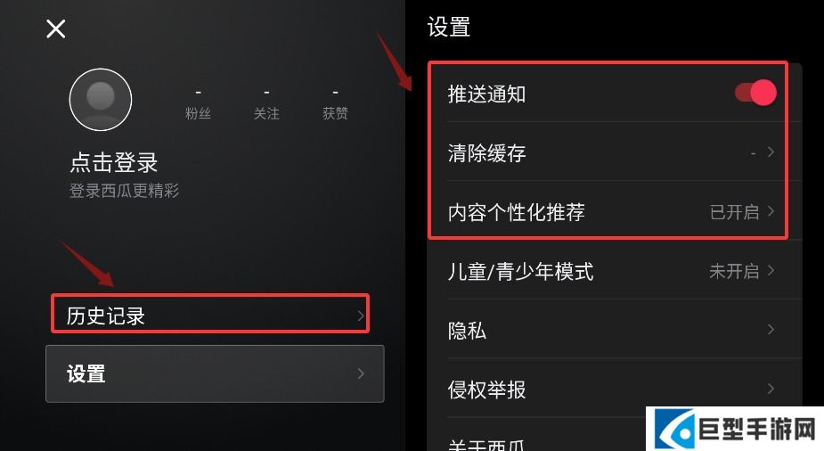 4、点击右上角菜单可查看历史记录,并在设置中管理推送通知、缓存及个性化推荐。