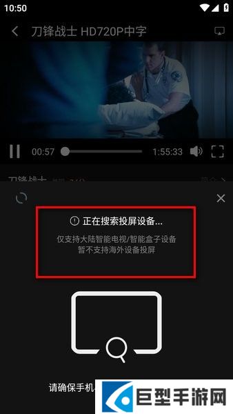 3、接着就会弹窗提示“正在搜索投屏设备...”,请确保手机和电视连接同一网络。