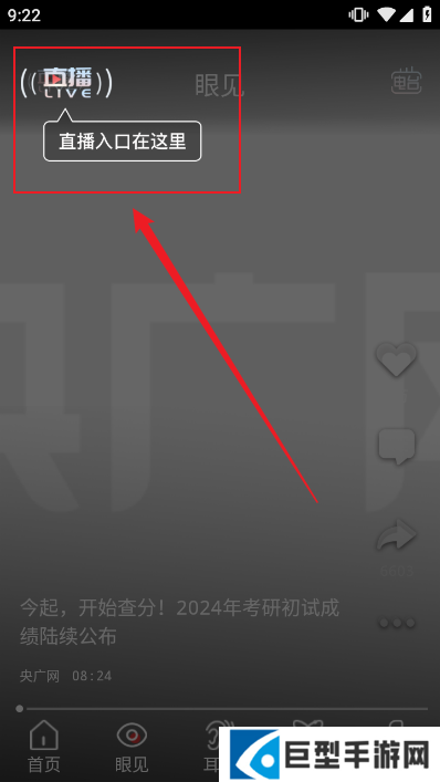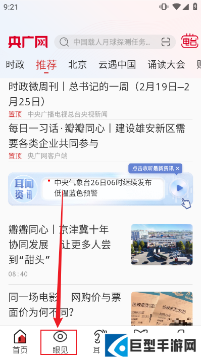 央广网怎么看直播?1、首先打开央广网APP,通过底部菜单栏进入眼见版块;