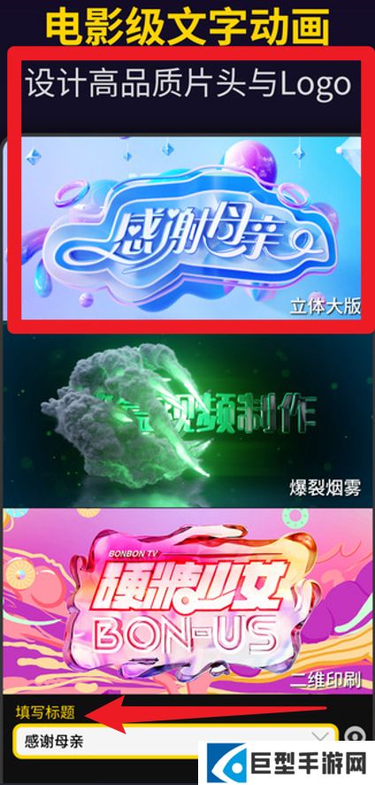 3、电影级文字动画功能可以帮助用户快速设计高质量片头与Logo,只需输入标题即可自动生成炫酷动画效果。
