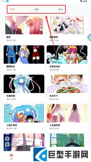 囧动漫最新版(囧次元)如何看漫画1、进入漫画专区后,您可根据偏好选择如冒险、恋爱等漫画题材类型。