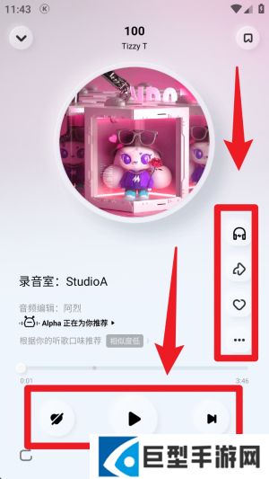 4. 进入播放页后可操作暂停、切歌、收藏、评论等操作,右侧还提供音乐电台和分享等扩展功能入口。