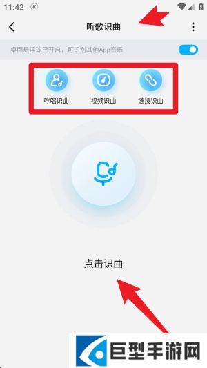 2. 在识曲页面中选择合适的识别方式,如哼唱识曲、视频识曲或链接识曲,也可以点击下方圆形按钮立即开始识别。