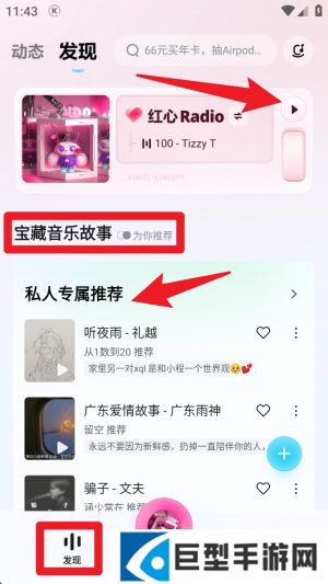 3. 回到「发现」页后,向下滑动可浏览推荐歌单与歌曲,点选红心 Radio 可直接播放相关推荐内容。