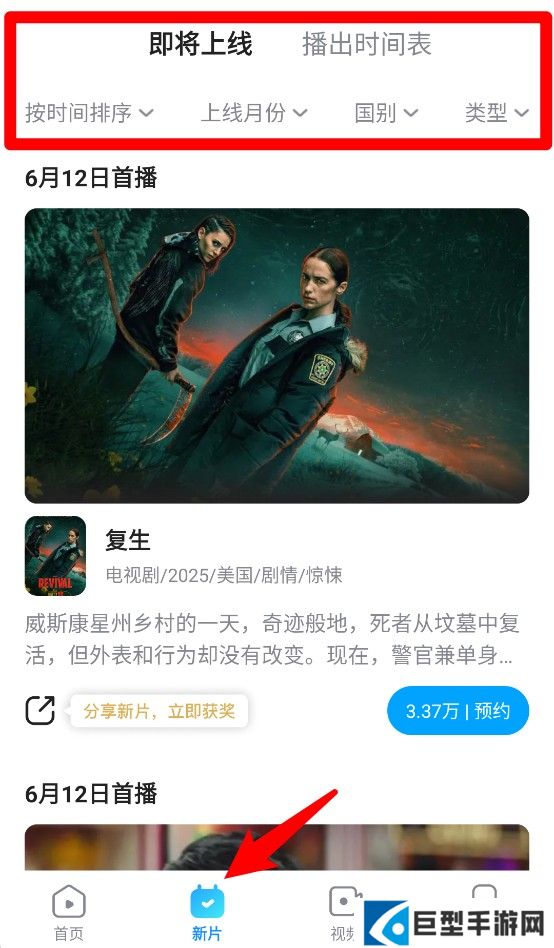 2、进入“新片”页面后可查看即将上线的影片,支持按时间、类型、国家等条件筛选内容。