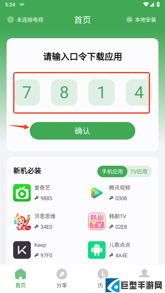 打开野草助手app,输入口令,点击确定,具体口令参考下文;