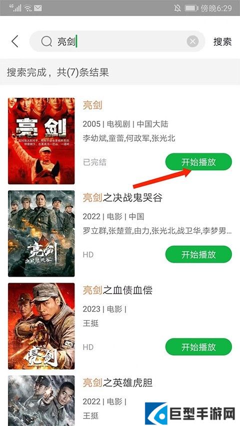 4、这里以亮剑为例,可看到出现相应的搜索结果,选择需要的内容点击【开始播放】选项;