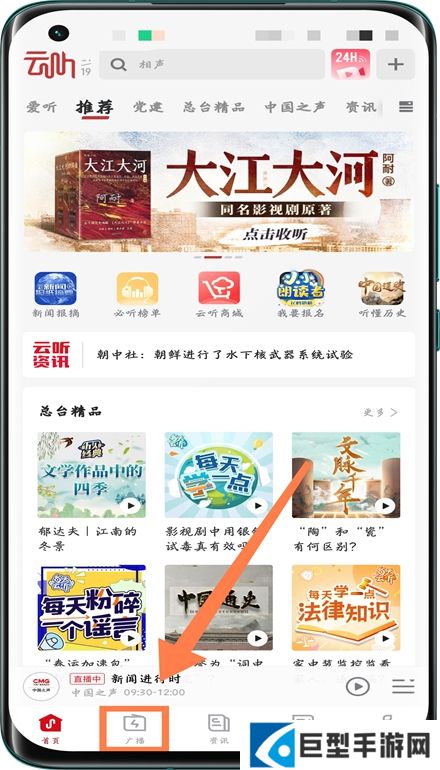 云听音乐怎么听广播电台?1、首先在本站下载安装云听app,然后点击首页最下方【广播】。