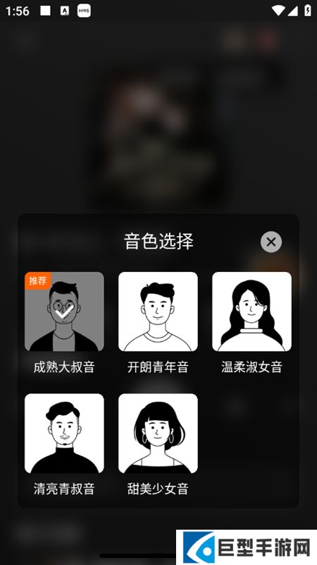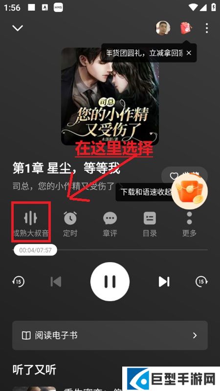 3、进入小说听书界面后,点击“音色选择”选项,点击进入。